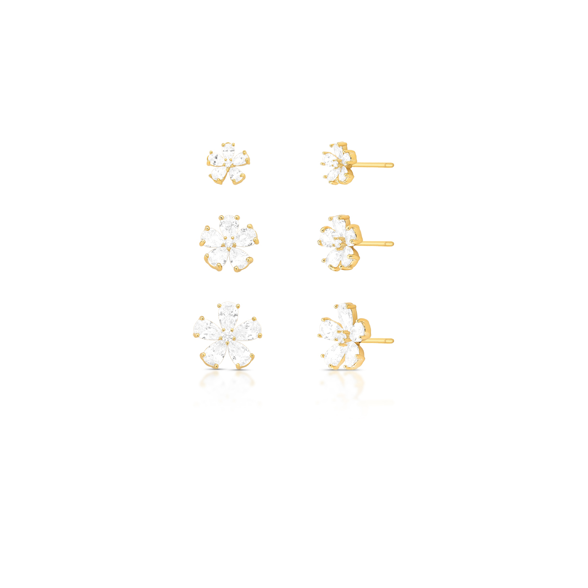 brinco trio pedra gota + zirconia flor curvo 7x9x10mm ban. dourado /incolor