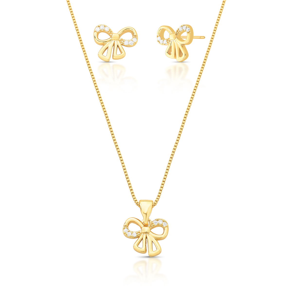 conjuntos brinco e corrente c/ pingente zirconia laco vazado trabalhado curvo 10x12x3mm/ 15x12x3