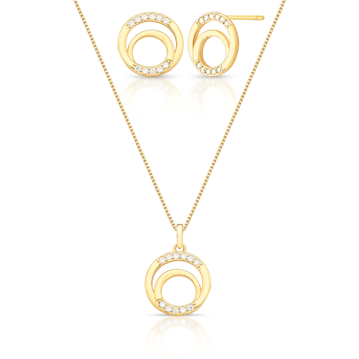 conjuntos brinco e corrente c/ pingente zirconia 2 redondo vazado 15mm ban. dourado /incolor /tam. 45